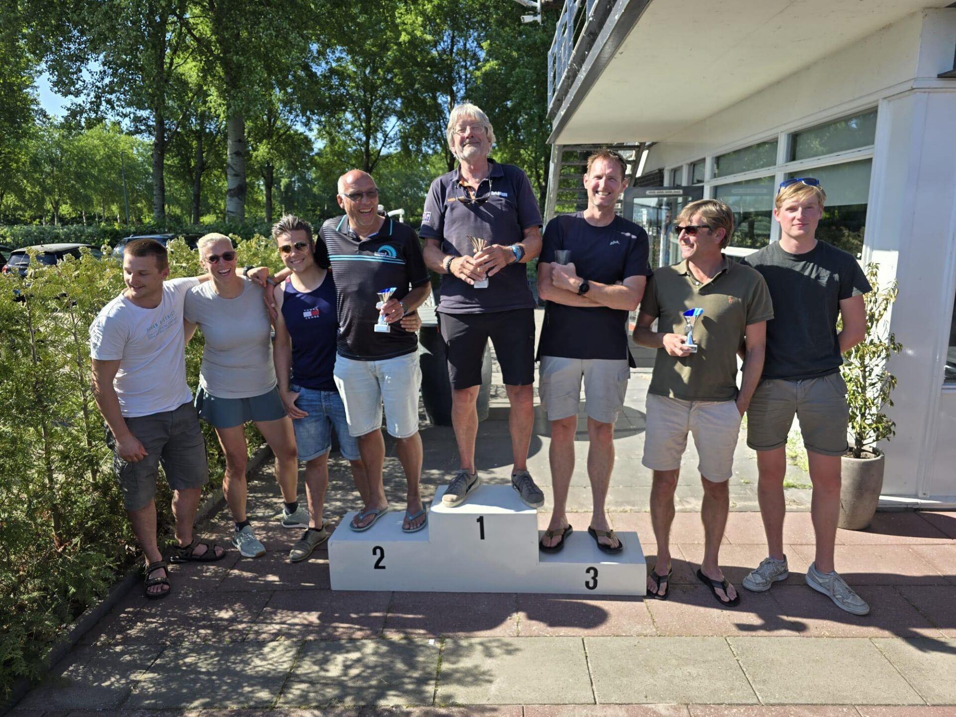 Zondag meer wind en met de high aspect de haven uit. Het waaide buiten iets minder dus onderweg naar de start ging de high aspect naar binnen en de genua naar buiten. Goede call bleek later! Het startschip was vaak de place to be en dat leverde mooie momenten op. Het starten ging lekker dit weekend en we kwamen vaak goed van de lijn. Vaak misten we wel ergens een shift en zeilden we wat achteruit maar we voeren lekker. Jonas was eager en leerde een hele hoop bij en het was weer super gezellig aan boord. Na de laatste finish afgekoeld met een biertje (het was een tropische dag) naar de haven en daar afgetuigd, opgeruimd en met z’n drieën nog even naar de overkant gereden voor de prijsuitreiking. We schoven zowaar een plekje op in het klassement door vandaag 2, 3, 3 en 3 te varen. Helemaal top! Toen de uitslagen van de losse wedstrijden online kwamen zagen we pas hoe close het was. Echt secondewerk bij iedere wedstrijd!